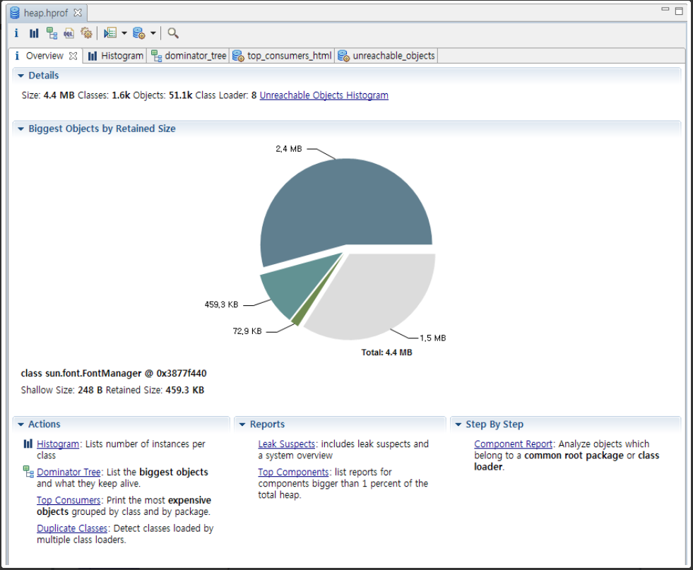- Top Consumers : 생성된 객체 중 가장 많이 생성된 객체를 중심으로 세부 정보를 표시한다. - Reposts : heap 영역에 대한 분석 리포트를 제공한다.