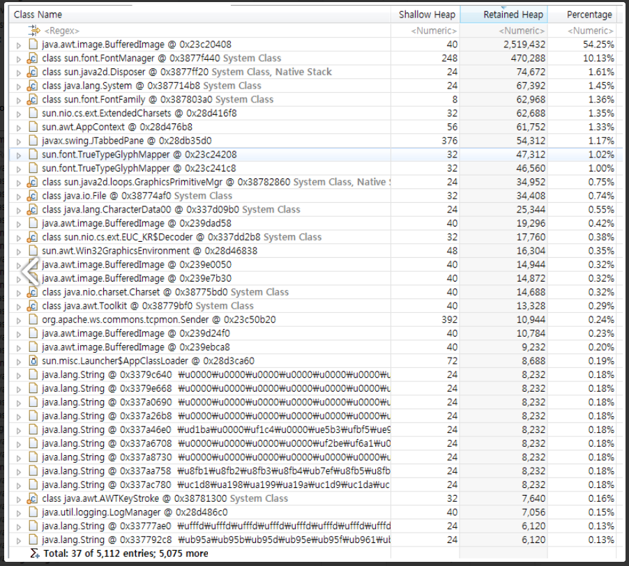 해당 클래스의 객체들 전체가 차지하는 영역(Retained Heap)을 표시한다.