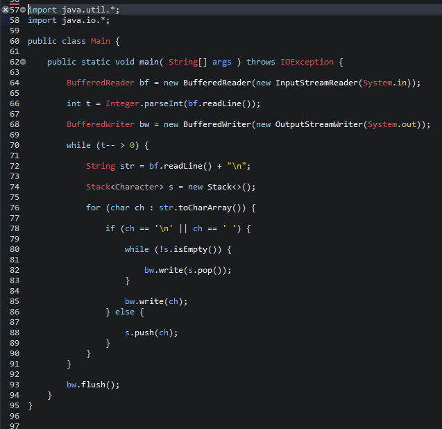 Stack이란, • 한쪽끝에서만자료를넣고뺄수있는자료구조 • 마지막으로넣은것이가장먼저나오기때문에 Last In Frist Out(LIFO)라고도한다. • push : 스택에 자료를 넣는 연산 • pop : 스택에서 자료를 빼는 연산 • top : 스택의 가장 위에 있는 자료를 보는 연산 • empty : 스택이 비어있는지 아닌지를 알아보는 연산 • size : 스택에 저장되어있는 자료의 개수를 알아보는 연산 Stack을 이용하여 풀기 좋은 문제들, - 단어 뒤집기 - 괄호 VPS(Valid Parenthesis String) 확인 - 수열 (어떤 규칙에 따라 차례로 나열된 수의 열) - 에디터 (커서이동) 1. 단어 뒤집기 예제 (9093번) import java.util.*; import java.io...